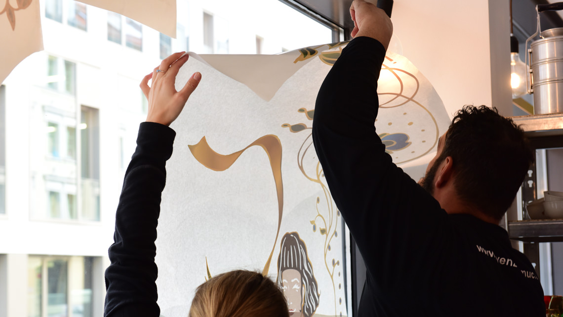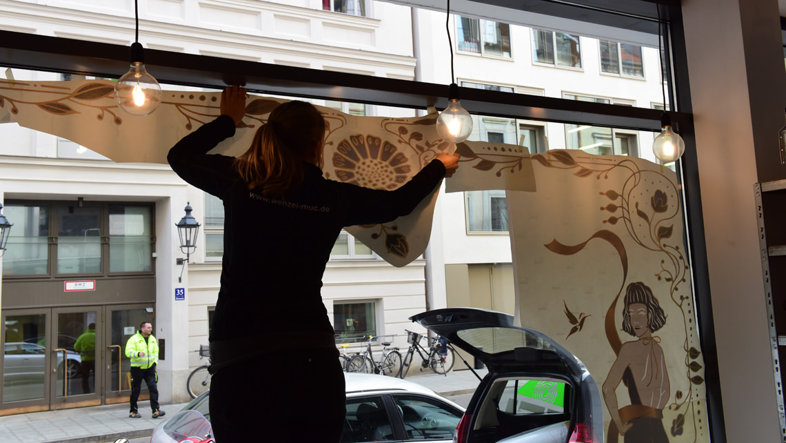 Diese Schaufensterbeschriftung lieferte die Designerin Sandra Fleißig. Ihren Entwurf produzierten wir auf Selbstklebefolie. Da es sich um große Teile handelte, waren vier Hände aus dem Hause WENZEL vonnöten, um die Kreation ans Fenster zu bringen. Zweimal waren ca. 3 x 4 Meter zu gestalten.